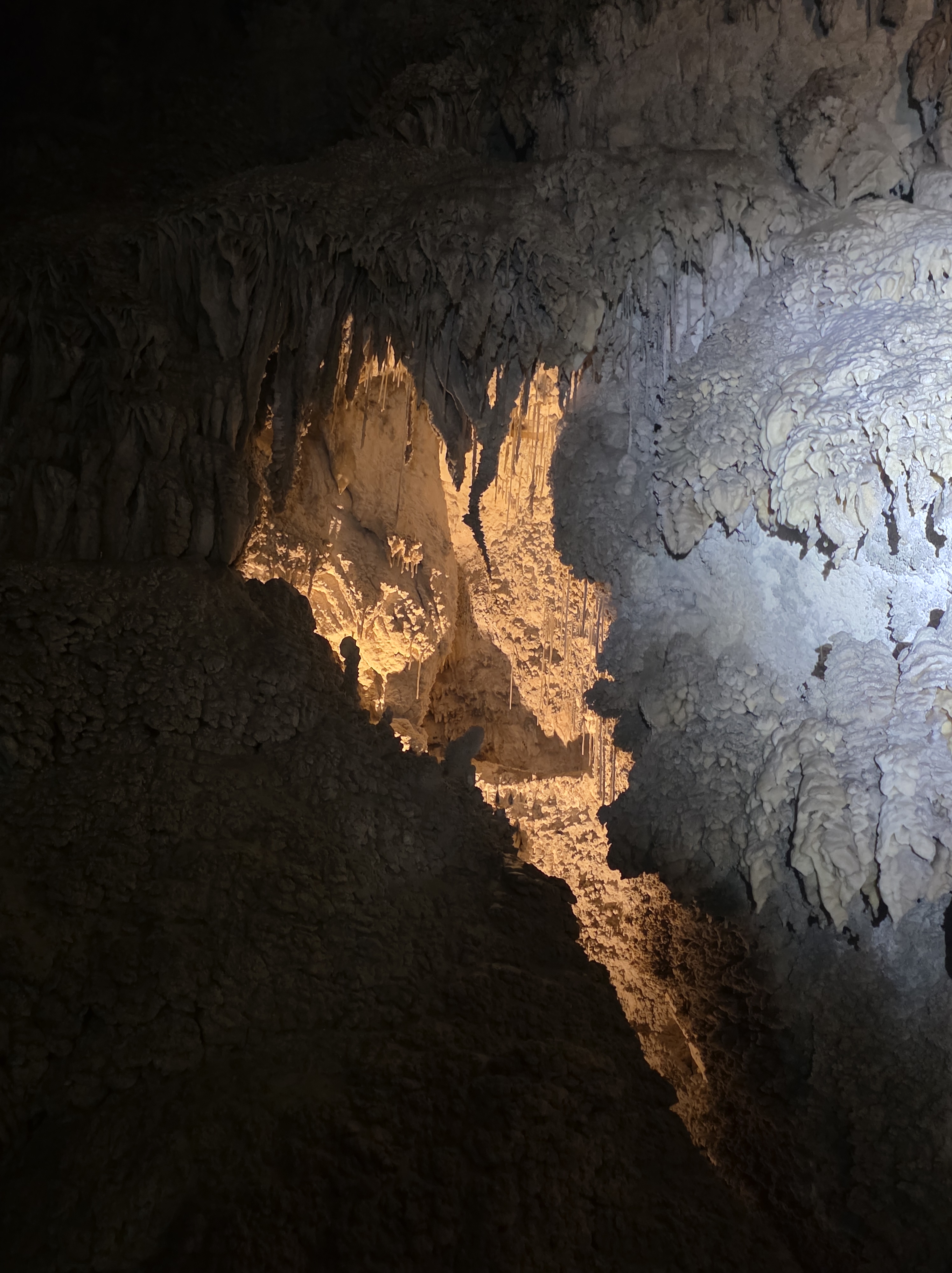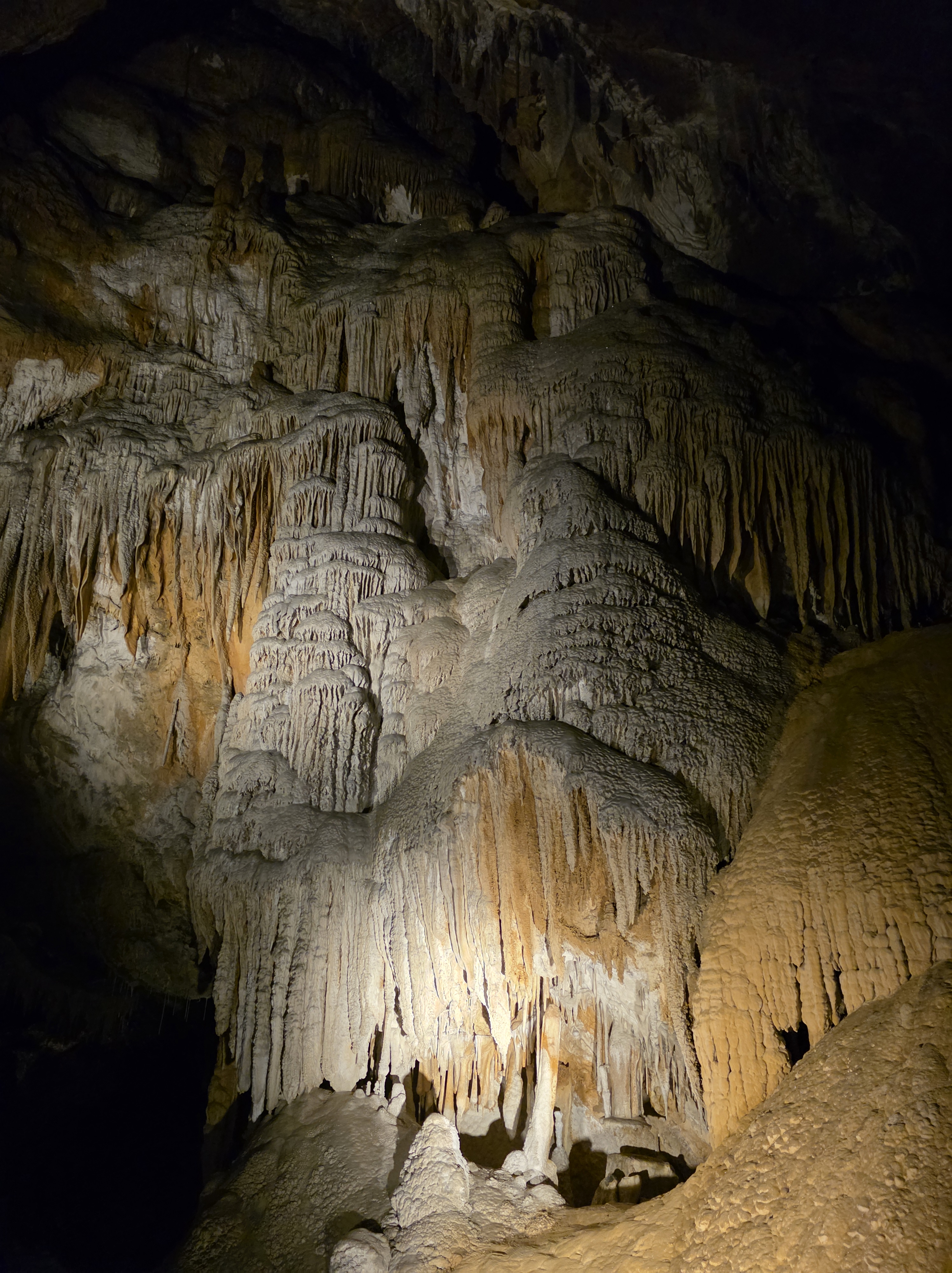 Our guide introduced the cave’s history and geology, then led us deeper along the concrete path. The creek was anything but gentle — at points reverberating through the chamber, reminding us how active and alive this system is. Along the route, we admired delicate formations — curtains, straws, columns and flowstones — each formed over thousands to hundreds of thousands of years. At the turnaround point, the creek reappeared below us, carving a canyon-like crevice through the limestone.